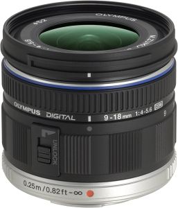 The Olympus M.Zuiko Digital ED 9-18mm f/4.0-5.6 Lens is a super-wide-angle lens compatible with Micro Four Thirds System cameras. It offers a 100° angle of view, and overturns the rule that super wide-angle zooms have to be big and heavy. With a length of just 1.9" (49.5mm) and a weight of just 5.5 oz (155 g), it is less than half the size and 60% of the weight of the Zuiko Digital ED 9-18mm f/4.0-5.6. With its wide angle of view, it makes it easy to include background scenery in group photos, and can be used to create unique images with a sense of dynamically exaggerated perspective.