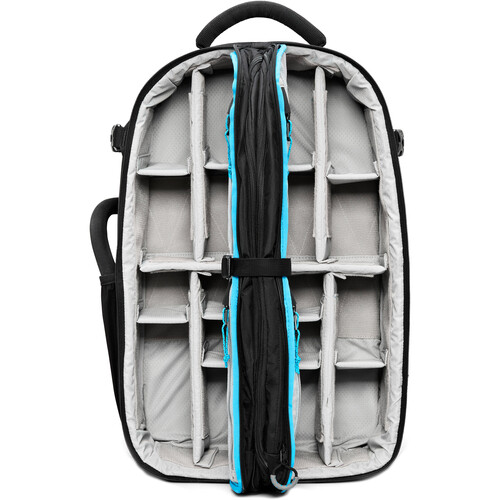 Two side-by-side, front-facing zippered panels fold open toward the center of the pack and provide individual access to the camera compartments. Two zippered mesh organizer pockets on each panel's interior store portable batteries, camera filters, or small electronics within the camera compartments. Each panel also features an outer flap that can be unzipped and opened toward the center of the backpack, even when the panels remain closed, revealing two additional organizer pockets for items that need be accessed quickly and conveniently without exposing the contents of the camera compartments.