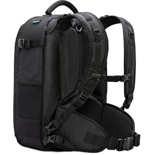 Carry options include a built-in top handle, a side handle, and padded, adjustable shoulder straps. The resilient and breathable 3D mesh padding along the rear exterior cushions your back and shoulders. The padding features an elevated structure to optimize air circulation, minimizing perspiration in warm and hot environments. For heavy loads, use the adjustable sternum strap and waist belt to evenly distribute the weight. The pack features two large, stretch side pockets with compression straps for water bottles, a tripod, a monopod, or a trekking pole.